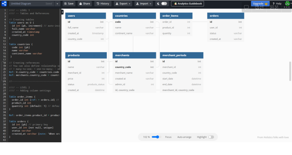 - DB 스키마를 이미 그린 상태라 SQL 쿼리문을 툴에 넣어서 ERD를 자동 생성함