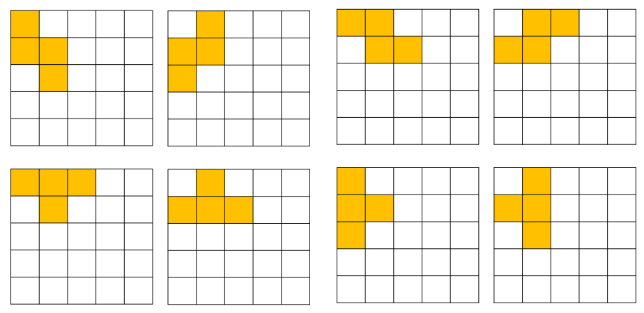 나올 수 있는 모든 테트로미노는 아래와 같다. 19가지 모양의 도형이 나온다.